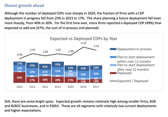 For small and mid-sized businesses, the picture looks very different. Adoption is still climbing. The CDP Institute’s most recent survey shows mid-market firms expect above-average new deployments, while the enterprise segment is flattening after earlier adoption waves.