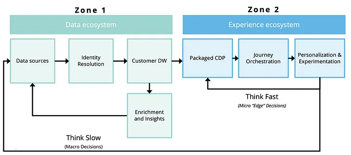 Stack drift doesn’t happen in a vacuum. It’s the natural result of teams pulling in different directions, each adopting tools that reflect their own priorities and ways of working. And that split maps almost perfectly to what David Chan has laid out in the Dual Zone model: a Data Zone built for identity, modeling, and governance, and an Engagement Zone for personalization, journey logic, and activation.