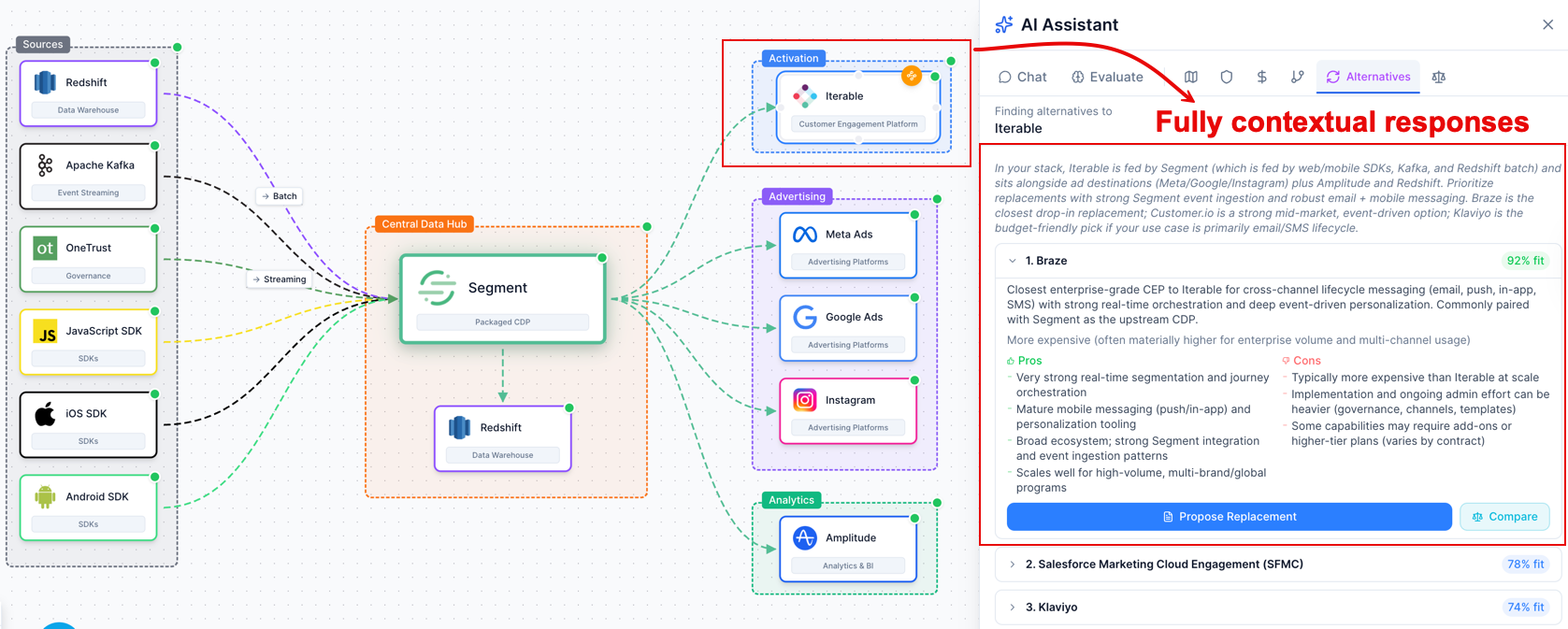 By right-clicking on a node in your martech stack, you can start the process of finding alternatives. The report is generated using AI and leverages your martech stack and all provided metadata points as additional context.