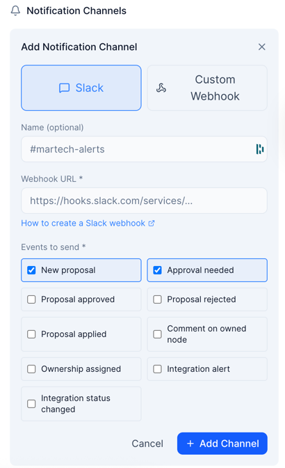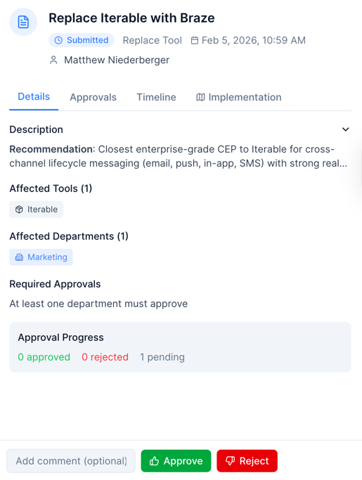 Describe what you want done, add the type of change, and add the tool(s) from your martech stack, and Department leads are automatically notified. Yes, this feature needs a lot of refinement, but the foundation is in place, providing an auditable timeline, an approval/rejection process, and a feature to generate a roadmap for the change.