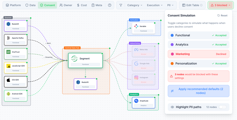 Want to know where data will or will not flow if a user does not give consent for marketing? Visualize it. Samen with PII. With various option available for defining PII flows through your stack, clicking on Highlight PII paths allows you to visualize the flow of PII data. More work is needed here to visualize the different sorts of PII handling (hashing, rejecting, storing etc.) but the basics are in place.
