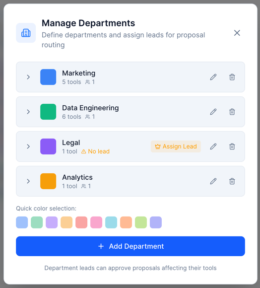 Before any major change starts, you should know who needs to be involved, right? For this reason, I built a Departments feature that lets you create departments (teams) that own or lead specific solutions. These Departments can then be assigned as owners of a specific solution in your Martech stack.