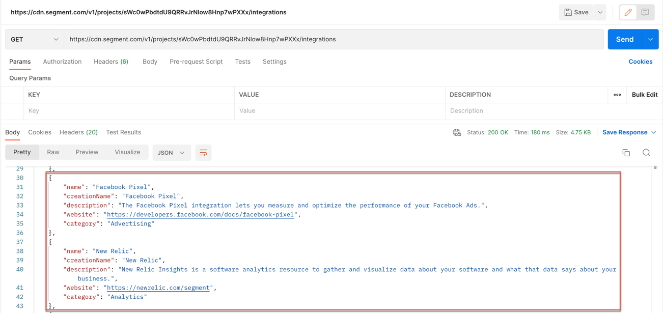 Since Free and Team plan users cannot use Destination Filters, we will leverage the default integrations object functionality. The integrations object will help you control how Segment routes collected data to specific destinations. The script calls a relatively unknown Projects API integrations endpoint. Together with your write key, you can retrieve a list of active destinations set up in your workspace.