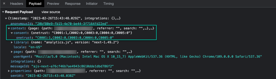 Business plan users have it a bit easier. Their method will only require the injection of the OneTrust cookie value, particularly the groups variable, from which Destination Filters can be built within Segment. No API call needs to be made, so this method is quicker. The location where the OneTrust cookie values are injected is the context object. The reason that we do not use the integrations object is that that would require an API call. Although the properties object would also be a feasible location, it would not match with identify calls where the properties object is replaced with a traits object.