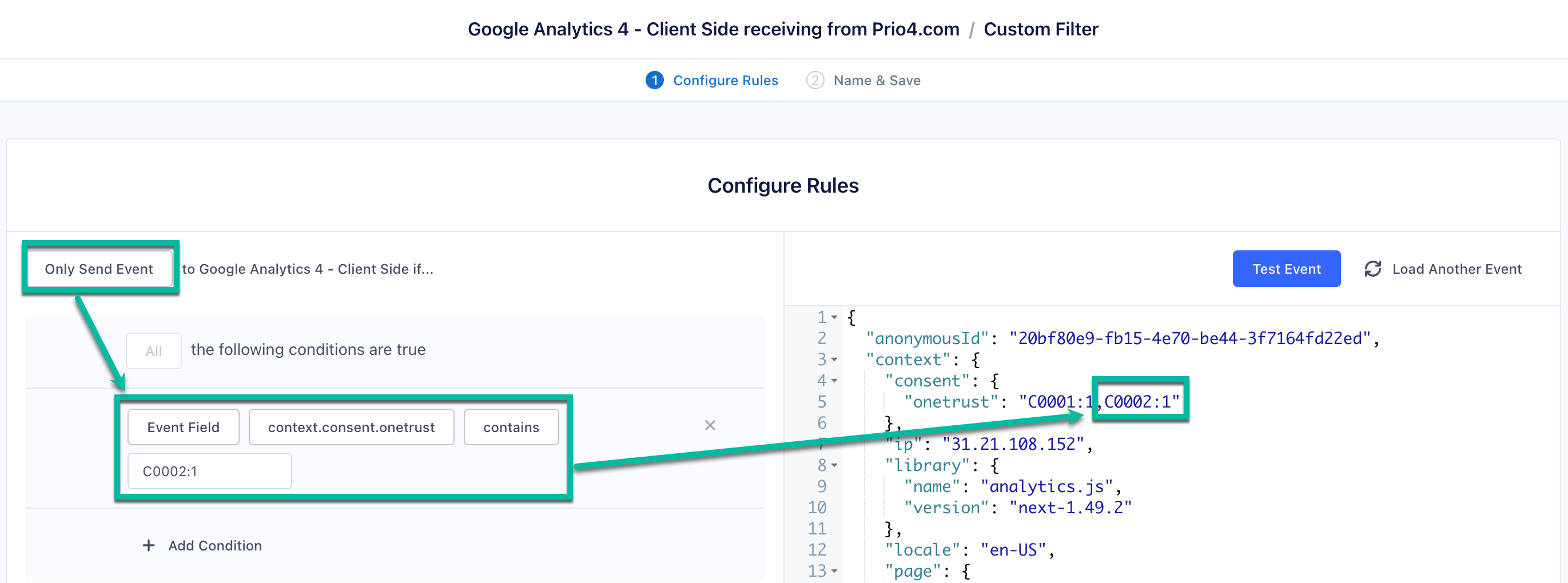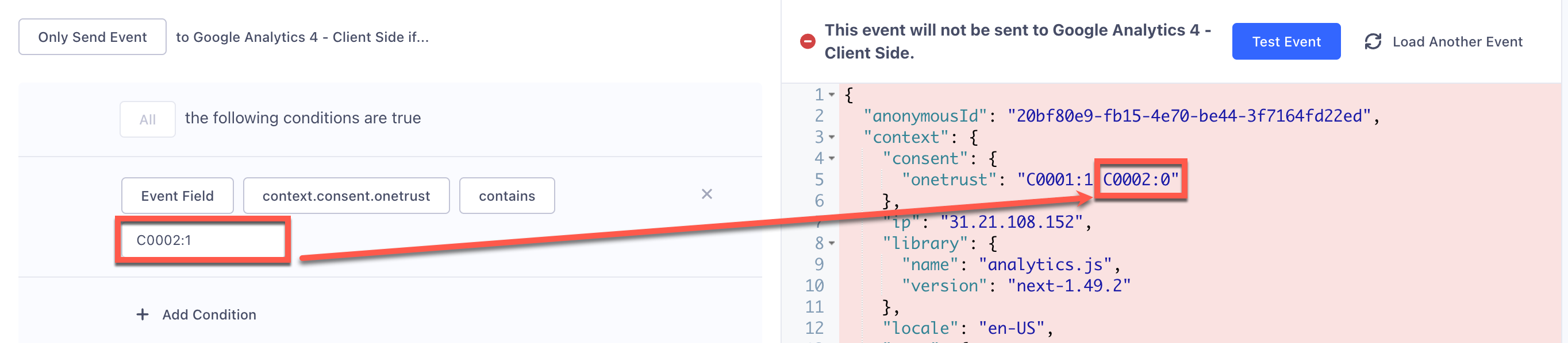 If you are on a Business plan, you can use Destination Filters to filter data based on rules. These rules can be defined per destination. Please remember to set the right filter for the correct type of destination. You should do this using OneTrust’s group ids.