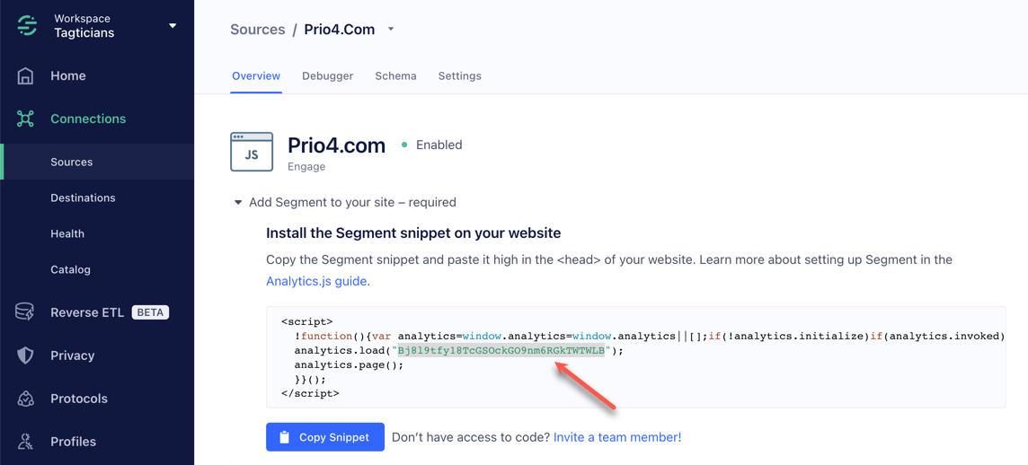 To find this, go into Segment > Connections > Sources and click on the Javascript source you want to implement the integration for. The key is not a secret; it can be found on any website using Segment.