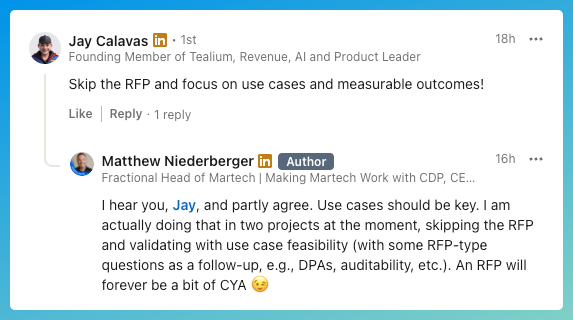 If you have been following my latest articles, The CDP RFP Dating Game and The Reference Call That Changed Everything, you will understand this article even more. This article, a follow-up in a sense, eventhough my goal was not to make a series, was partly inspired by Tealium’s Jay Calavas comment on my LinkedIn post, stating: