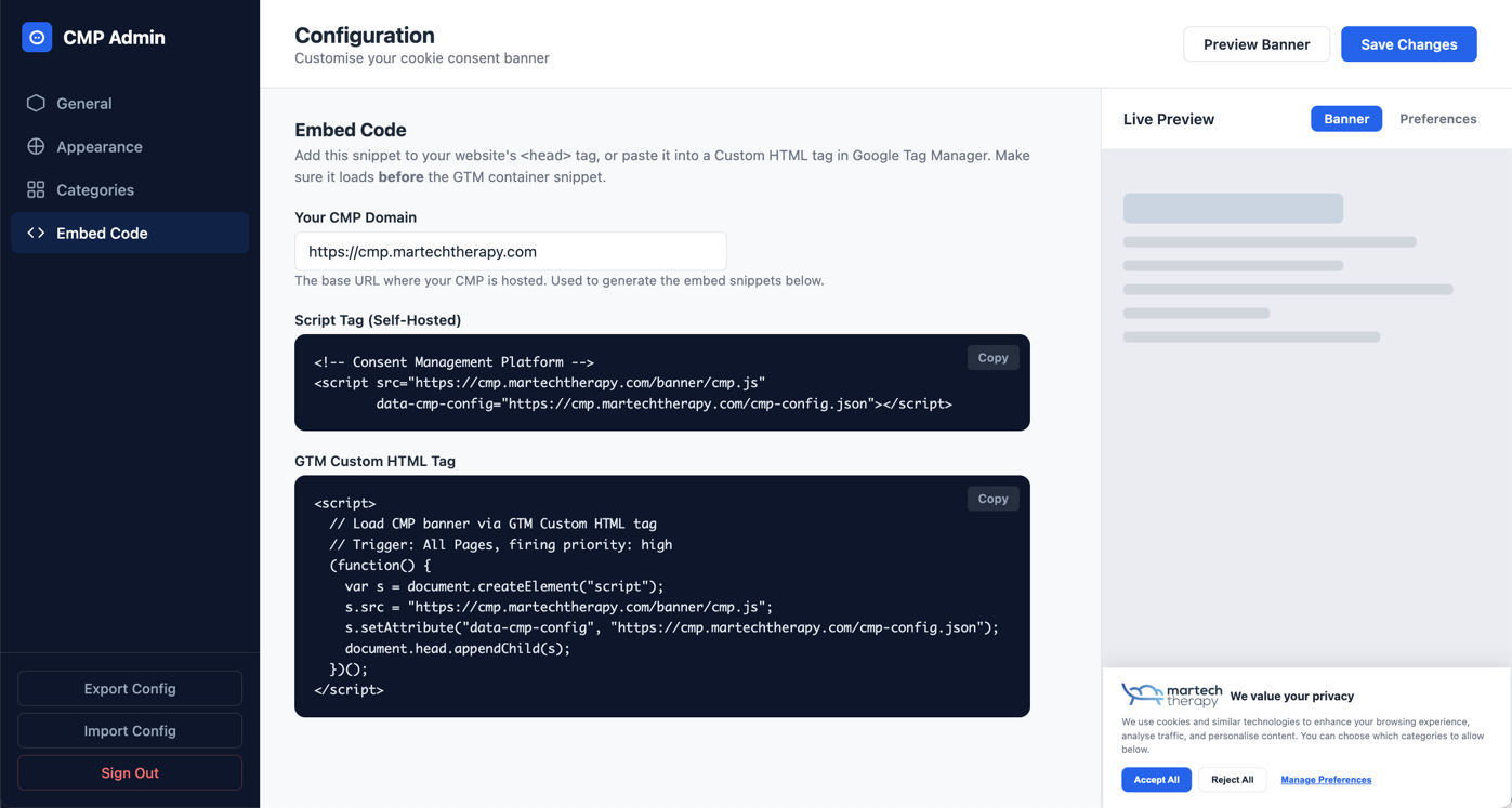Nothing revolutionary. A cookie banner. Preference settings. Google Consent Mode logic. A small admin interface. A script that could be injected into a website.