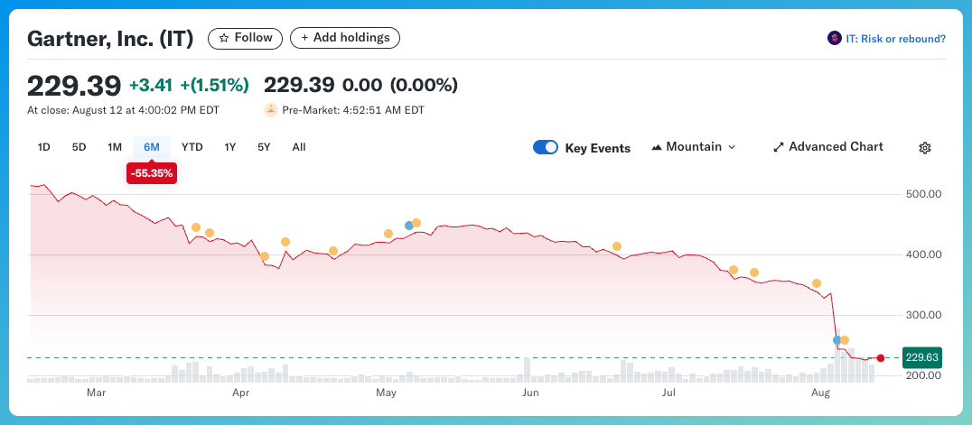 Ironically enough, Juan Mendoza, CEO of The Martech Weekly, recently posted on LinkedIn about reading the life story of Gideon Gartner, just as Gartner’s stock was taking a sharp dive (I had no idea part 1 of this series would have such an effect, just kidding, I hope…). In his post, he reflects on how the company was once groundbreaking in its ability to analyse the market from the perspectives of investors, customers, and vendors, but is now struggling to stay relevant in an AI-driven, information-saturated era.