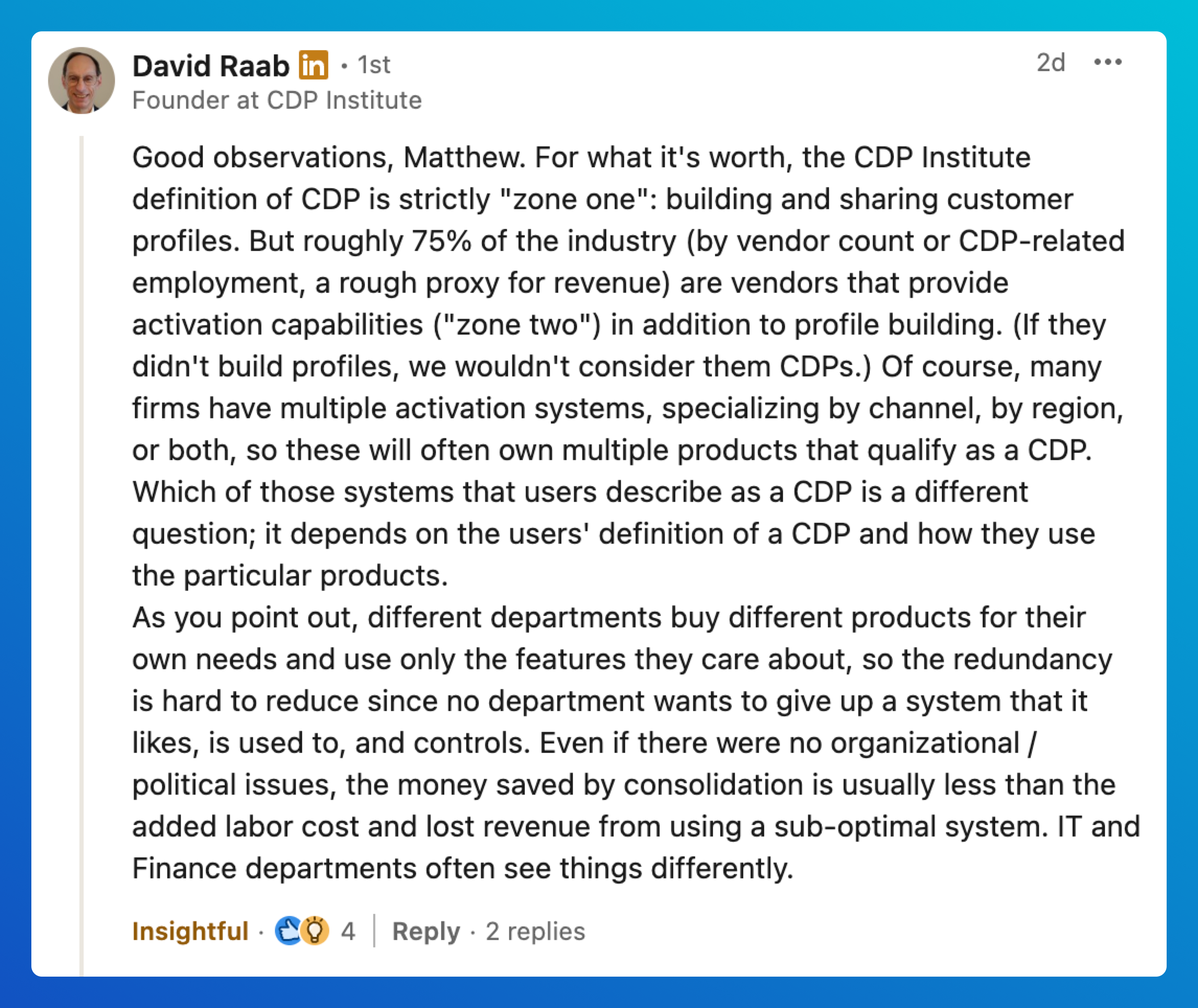 And like David Raab recently pointed out to me on LinkedIn, the market now expects activation to be bundled in. Even though the CDP Institute defines the category strictly around profile building, 75% of vendors now include activation capabilities too.