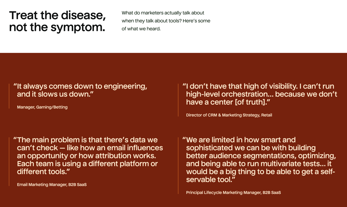 You know what sells software? "Data readiness assessments". Or "AI maturity models". Maybe even "Integration roadmaps". These are things you can put in a PowerPoint and present to a board. "Your CMO and CTO need couples therapy" is not.