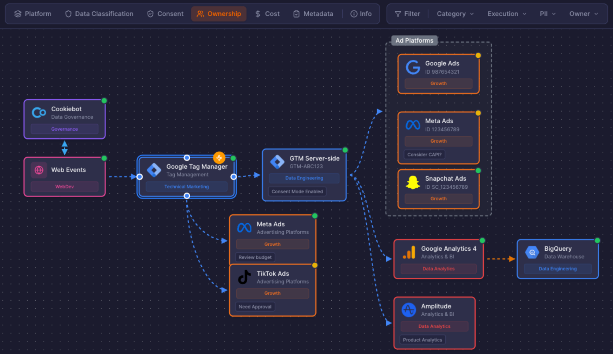 That insight led to the Multi-Lens model. Each node in the stack stopped being just a logo and started carrying meaning. Ownership. PII level. Cost signals. Status. Accountability. Dependencies.